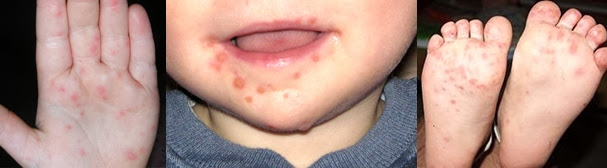 3. Starts as a small boil around mouth and it slowly spreads to hand and foot.